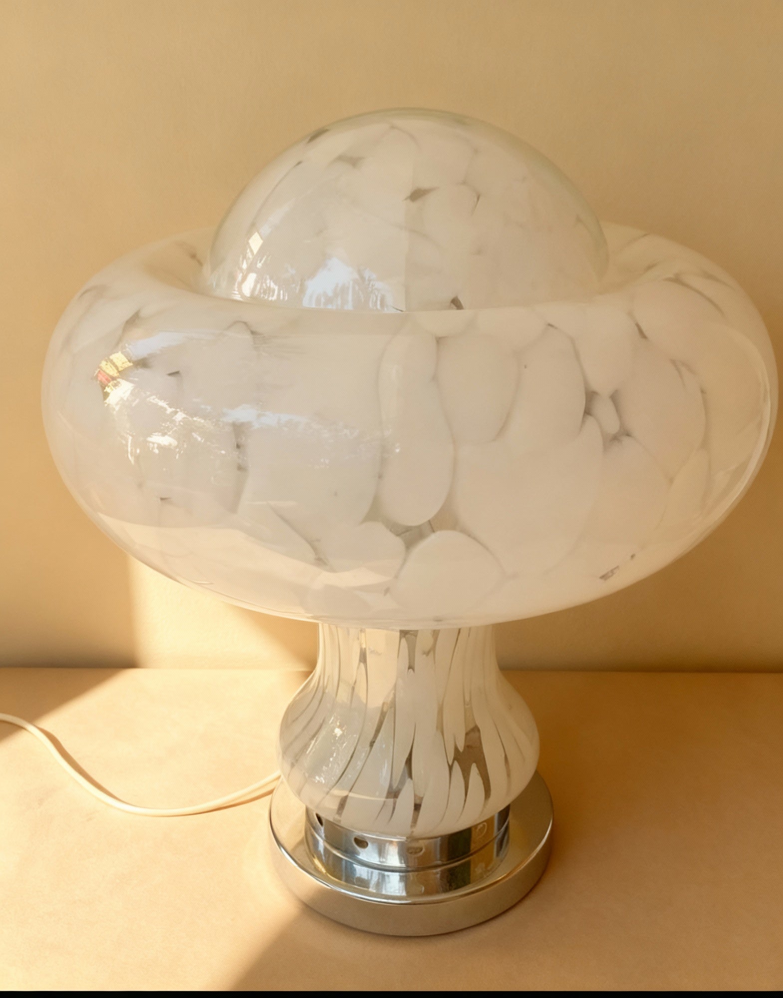 Esta lámpara de mesa italiana, diseñada por Carlo Nason para Mazzega y producida en Murano (Venecia) en la década de 1980, combina cromo y vidrio para crear un objeto que es a la vez funcional y escultórico. El difusor de vidrio moteado ofrece un brillo cálido y envolvente cuando está encendida y, apagada, permanece como una pieza de cristalería de autor que aporta carácter a cualquier espacio.