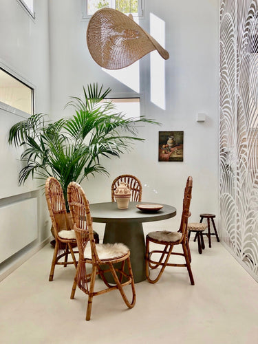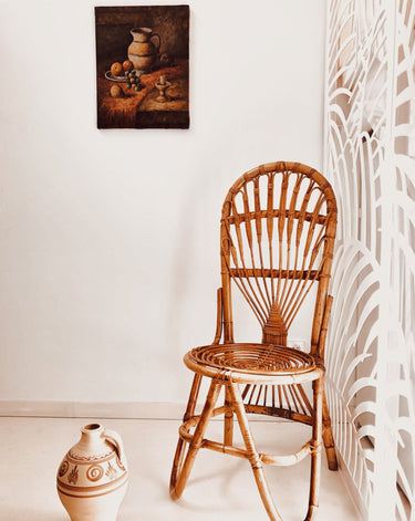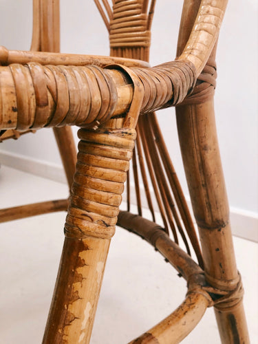 Espectacular silla  alta de jardín de Bambú, confeccionada en Francia en los años 1960, inspirada en el estilo innovador de Dirk Van Sliedrecht, reconocido pionero en el diseño de muebles utilizando ratán de Bambú y otros materiales livianos y asequibles durante la reconstrucción de Europa tras la Segunda Guerra Mundial.
