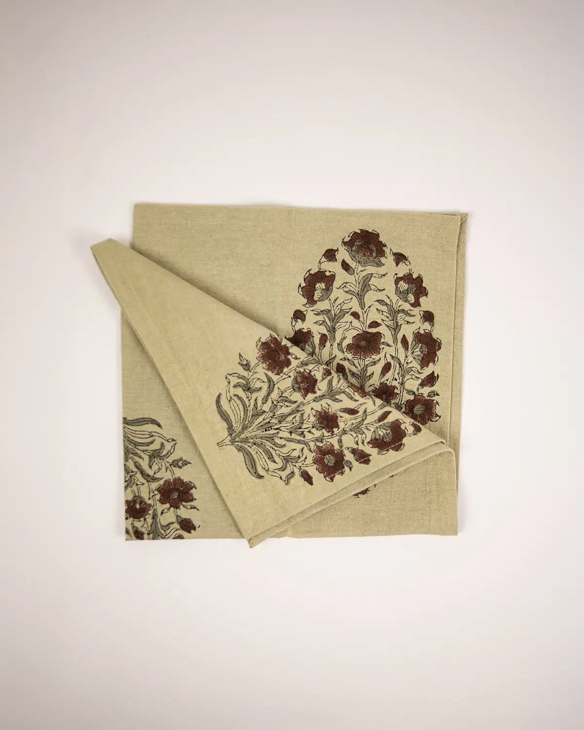 Servilleta de 100% algodón con acabado suave, trabajada mediante técnica de estampado a mano con bloques de madera que aporta variaciones únicas en cada pieza. Mide 50 x 50 cm, adecuada para mesas informales y formales; resiste lavados frecuentes y mantiene la textura natural del algodón. Aporta un toque artesanal y textural a la mesa sin requerir cuidados especiales: lavar a 40 °C y planchar a temperatura media. Se vende por unidad y presenta ligeras diferencias de color y patrón propias del proceso manual.