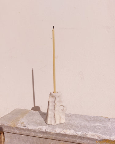 This handcrafted, artisanal ceramic candle holder is a delicate and unique piece. Made of white stoneware and featuring a Limoges porcelain slip, each piece reflects the pursuit of perfection in simple, elegant forms, combining experimental textures and finishes.