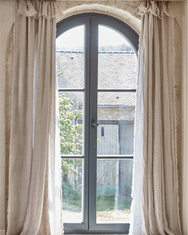 Subtle and elegant, these washed linen curtains in a natural tone gently diffuse light, creating a serene and luminous atmosphere. Their high-quality chevron weave combines the softness of washed linen with an elegant crinkled look and a fluid drape that moves in the breeze.