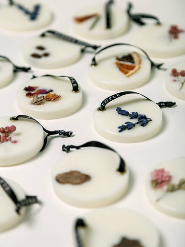 • Solid soy wax stick air fresheners : Handmade and decorated with botanical elements.