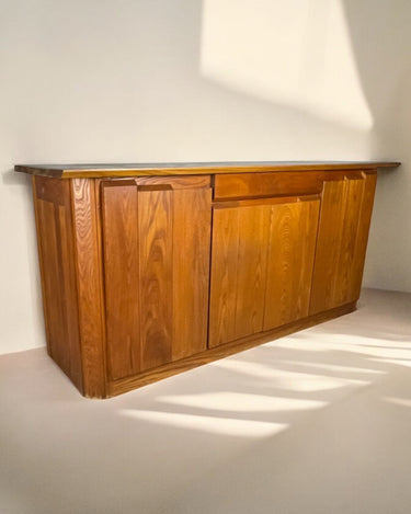 Discover this rare vintage French sideboard from the 1970s at Matuta Home , an iconic piece from the renowned Maison Regain . This piece stands out for its minimalist design , characteristic of the era, where functionality and beauty come together in perfect harmony. Made from high-quality solid wood, its handcrafted finish enhances the natural tones and texture of the wood, turning it into a timeless work of art.