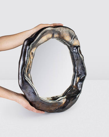 This exclusive dark organic mirror, handcrafted by the ceramist at Otkhi Ceramic, is much more than a simple decorative accessory: it's a functional piece of art that captivates and transforms any space. Its iridescent reflections add a touch of magic and dynamism, revealing a new range of colors and nuances at every angle.