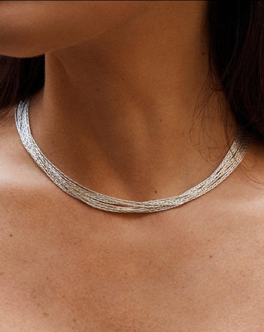 Enhance your style with our exquisite silver-plated Chiara choker necklace from Agapée Jewelry. Designed with multiple twisted cable chains, this necklace creates an elegant drape that will exude glamour and sophistication for any occasion.