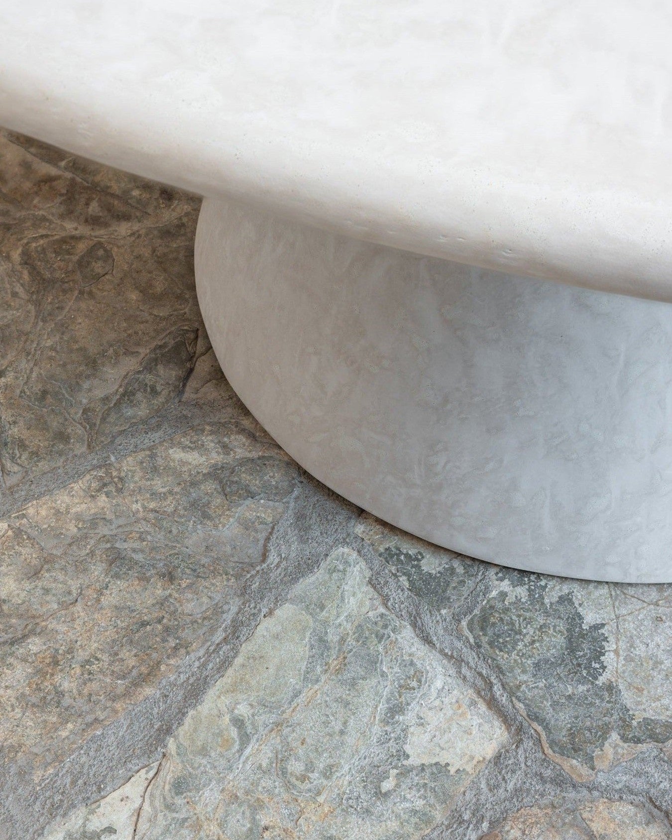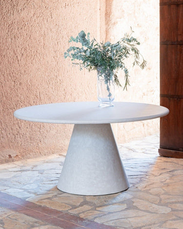 El estuco planchado en color piedra caliza envuelve la mesa con un aspecto mineral, mate y elegante. El resultado es una estética atemporal que encaja igual de bien en interiores mediterráneos, contemporáneos o rústicos depurados.