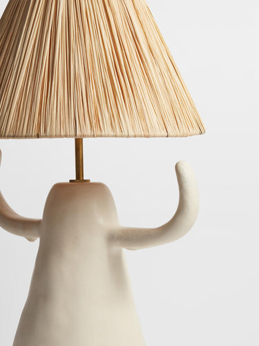 La lámpara  escultórica Dona es una pieza única de cerámica hecha a mano, inspirada en la figura de una mujer con los brazos levantados, de ahí su nombre. Esta obra, diseñada y creada por la reconocida ceramista Marta Bonilla, encapsula la pureza, simplicidad e inocencia que caracterizan a las formas más bellas de la cerámica.