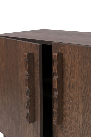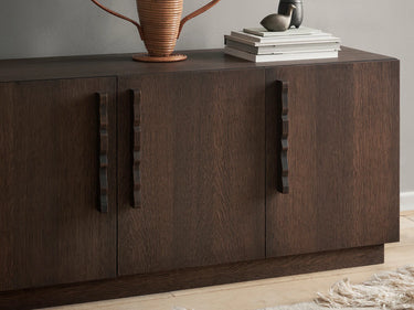 Este aparador de madera oscura combina una estética robusta y elegante con un toque de originalidad gracias a sus tiradores ondulados que añaden dinamismo a su diseño clásico. Fabricado en roble teñido oscuro con certificación FSC™, esta pieza refleja un compromiso con la sostenibilidad y el uso responsable de los recursos.