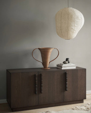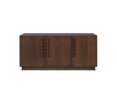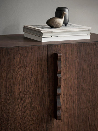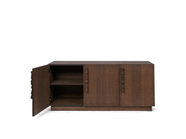 La versatilidad de este aparador de madera oscura de Ferm Living se destaca en su interior modular, con estanterías ajustables que te permiten personalizar la altura de cada compartimento según tus necesidades de almacenamiento. Su interacción entre la solidez de la madera y el carácter lúdico de los tiradores lo convierte en una pieza atemporal que se adapta fácilmente a cualquier espacio, desde el salón hasta el comedor o el recibidor.