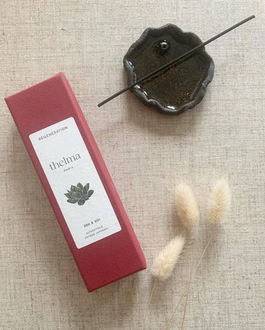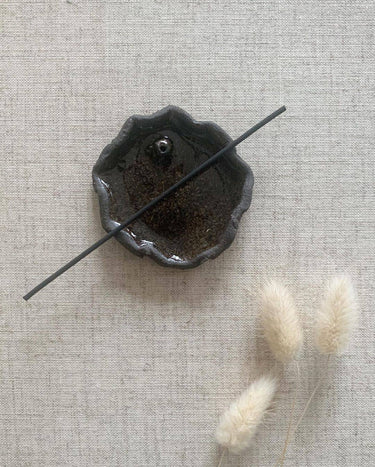 Chaque porte-encens est unique. Les porte-encens Wabi-Sabi sont fabriqués à la main par Silène Fry pour Thelma Paris en quantité limitée. Silène est une artisane céramiste qui a son atelier à Paris. Silène découvre la céramique en 2018 lors de son installation à New York. Il débute sa pratique au studio japonais Togey Kyoshitsu. Pour toutes ses créations, ses inspirations proviennent de la philosophie japonaise du Wabi-Sabi, que l'on peut définir comme la recherche de la beauté dans « l'impermanence et l'imperfection ». Le porte-encens est en grès chamotté noir recouvert d'un vernis transparent lui donnant une couleur chaleureuse qui se marie à votre intérieur. Le trou pour placer le bâton est idéalement situé sur le côté, permettant ainsi aux cendres de se déposer au centre sans difficulté. Dimensions : environ 7 cm de diamètre.