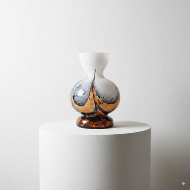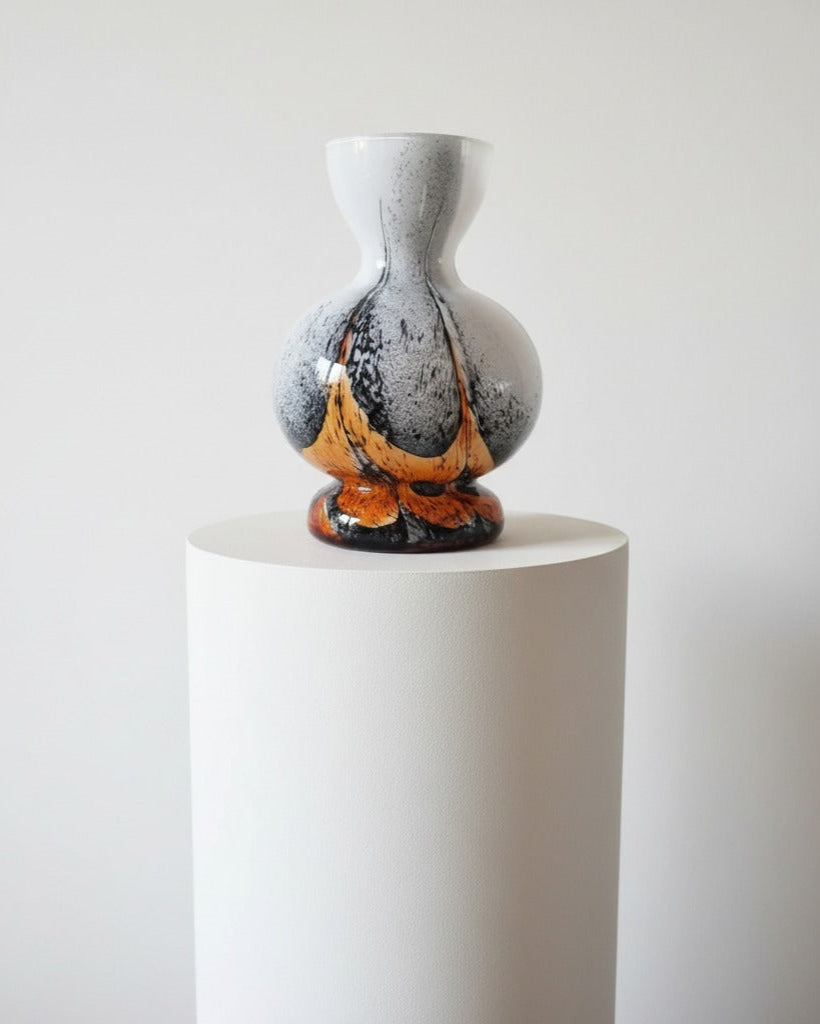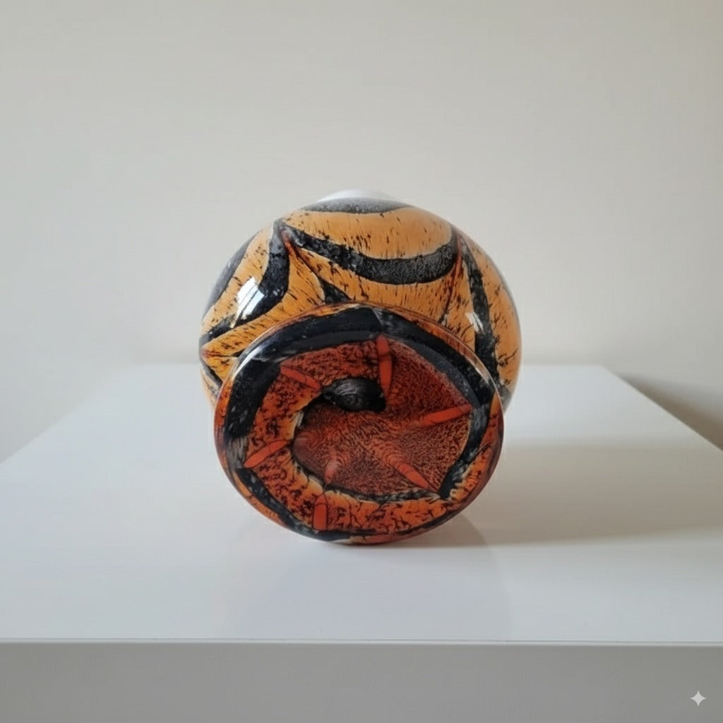 Pieza vintage italiana con presencia escultórica y una paleta vibrante en blanco, naranja y negro. Este jarrón de vidrio opalino atribuido a Carlo Moretti (Murano, años 60/70) aporta luz, color y una elegancia gráfica que transforma cualquier rincón del hogar.