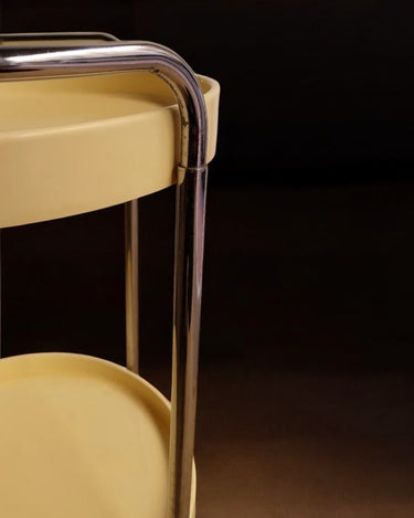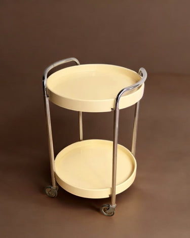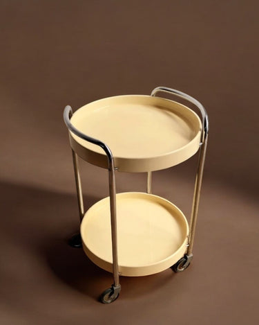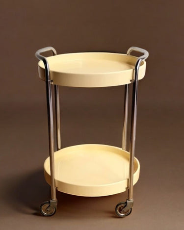 Descubre nuestro exclusivo carrito camarera vintage original, diseñado en el icónico estilo Space Age de los años 60 y fabricado en Italia. Este singular carrito de servicio combina una estructura plegable de metal cromado con dos elegantes bandejas circulares en plástico resistente color blanco roto, ofreciendo un diseño retro que aporta personalidad y sofisticación a cualquier ambiente.