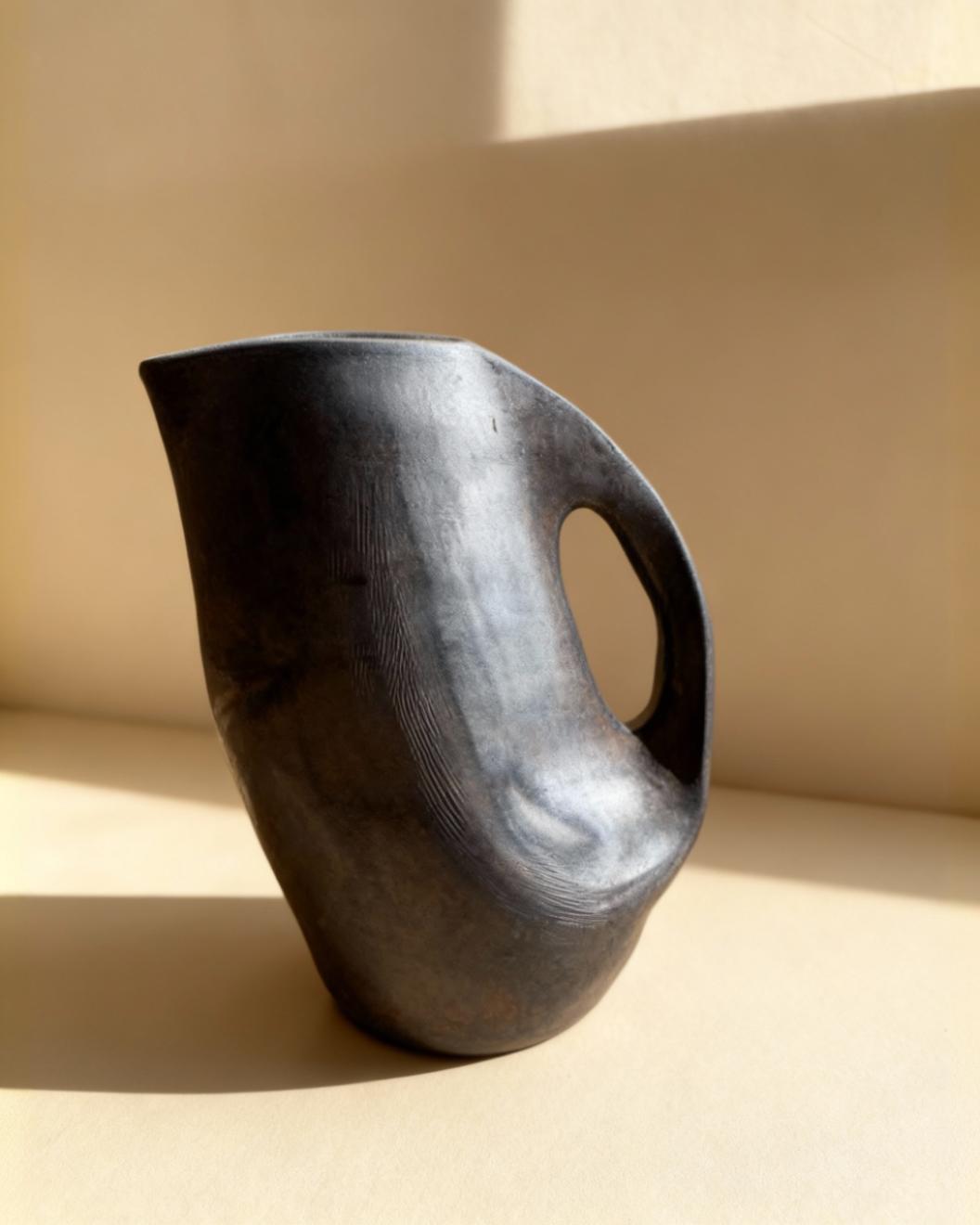 Elaborada en cerámica artesanal y esmaltada en un profundo marrón oscuro, esta jarra destaca por su volumen orgánico y su gesto casi escultórico. No es una pieza más: es un objeto con fuerza visual, que aporta calidez y personalidad tanto si la usas como jarrón como si simplemente la dejas lucirse sola.