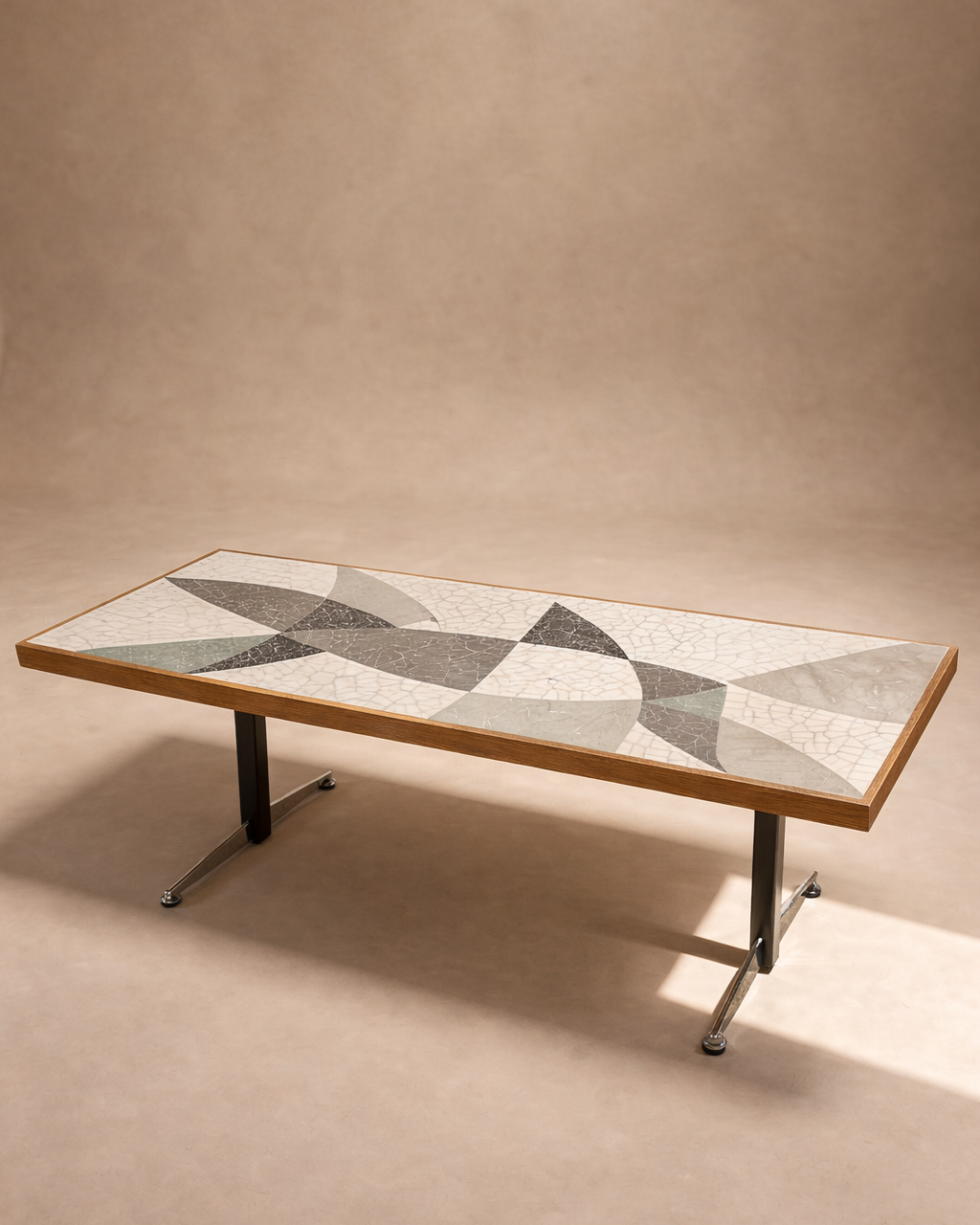 Esta mesa de centro alargada vintage reúne la elegancia serena del mármol con el carácter artístico del mosaico. Su diseño de inspiración mid century destaca por la composición geométrica en blanco y gris, una combinación atemporal que aporta luz, equilibrio y personalidad al salón.