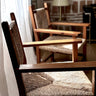 El trenzado artesanal en fibra natural aporta comodidad, transpirabilidad y un detalle estético único. El diseño geométrico del respaldo refuerza su carácter artesanal y convierte cada sillón en una pieza especial.